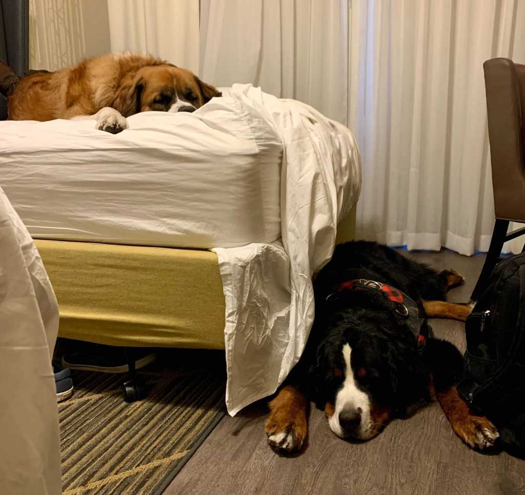 If neither of these are on your map, BringFido is a great resource. If you also have giants, always double check the “large dog allowed” classification often includes hotels that have 70-80 pound weight limits.